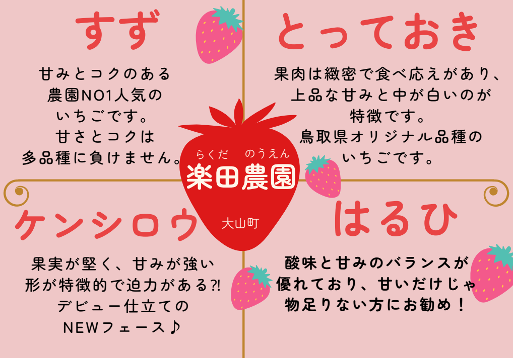 鳥取県でしか栽培できないオリジナル品種「とっておき」をはじめ、それぞれ個性の異なる苺たちは、どれも私たちの自慢の味わいです。